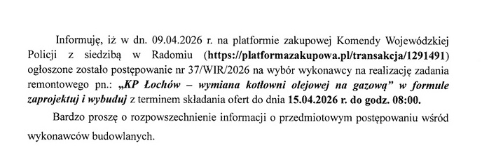 Ogłoszenie o wyborze wykonawcy na realizację zadania remontowego w KPP Łochów